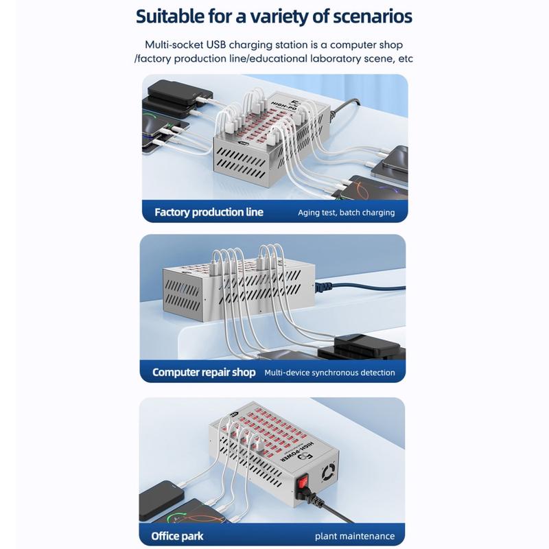 - Arbetsstationer och reparationsverkstäder: ladda kundernas telefoner och testa enheter i omgångar