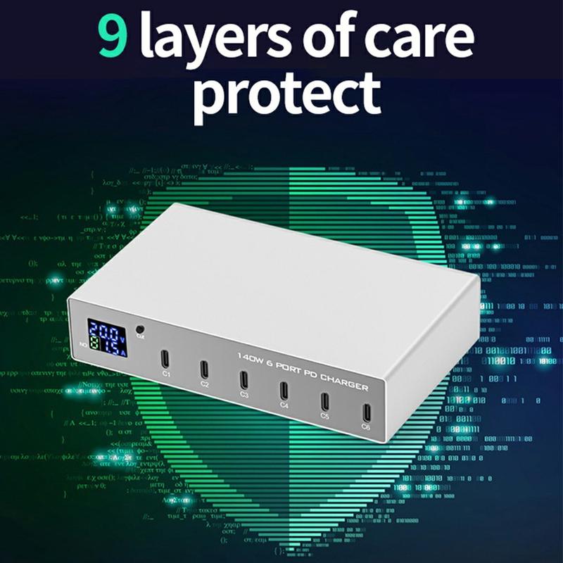 WLX-X6P levererar stark uteffekt, smart laddningsintelligens och GaN-effektivitet i en kompakt enhet. Dess sex USB-C-portar gör den idealisk för snabbladdning av flera enheter samtidigt, medan den inbyggda digitala displayen och skyddssystemet garanterar säker och stabil daglig användning. En perfekt allt-i-ett-laddningshubb för hem, kontor och resor.