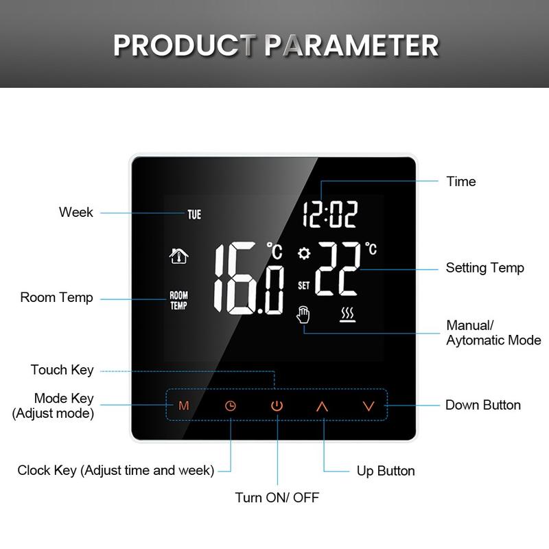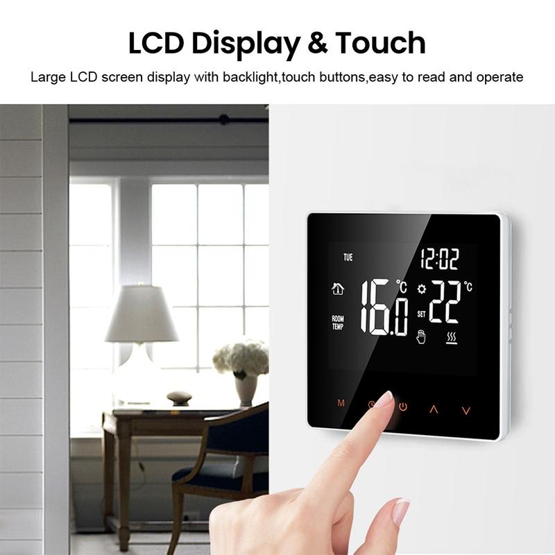 Den stora LCD-pekskärmen med bakgrundsbelysning är lätt att läsa både dag och natt. Den eleganta designen i ett stycke ger termostaten ett snyggt och modernt utseende, medan den reptåliga ytan hjälper den att behålla sitt snygga utseende över tid. Du kan välja mellan manuellt läge för direkt justering och automatiskt läge för programmerad uppvärmning, beroende på din dagliga rutin och dina personliga preferenser.