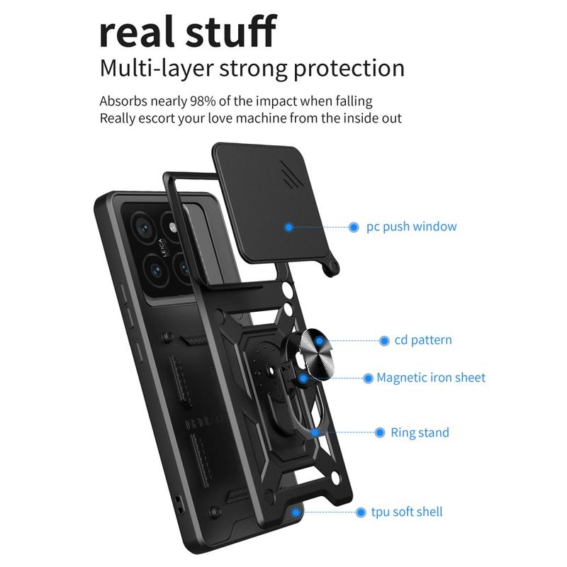 Konstruerad med förstklassig plast, TPU och metallmaterial, är detta fodral för Xiaomi 14T Pro designat för att stå emot tidens prövning och ge skydd. Med flera funktioner skyddar det din Xiaomi 14T Pro perfekt och gör den även bekväm att använda och titta på tack vare den roterande ringen på baksidan.