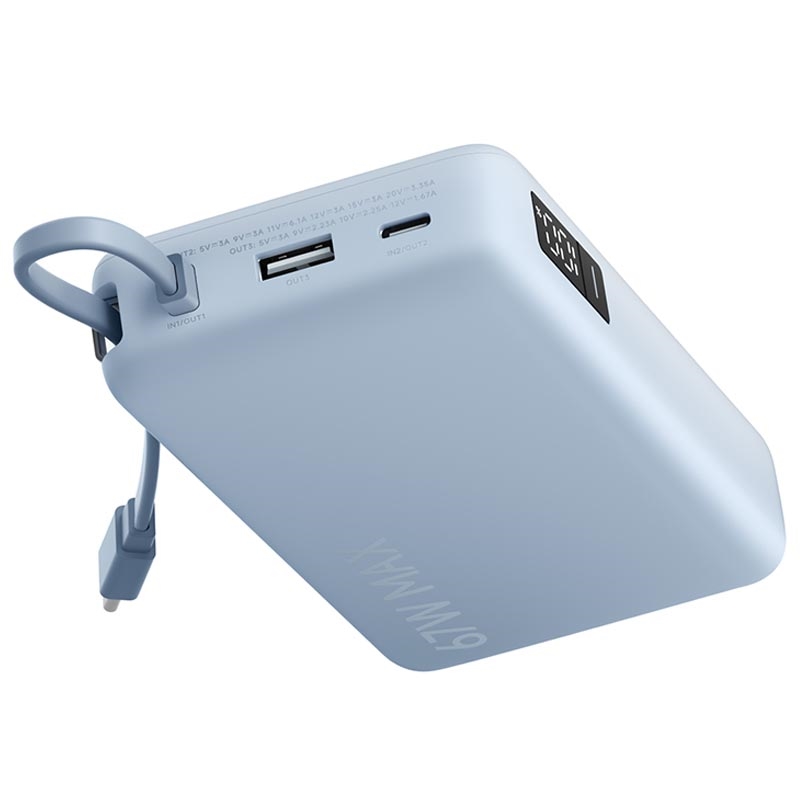 Denna powerbank är idealisk om du vill ha snabb laddning med en resevänlig design. Utgången på 67W täcker mer än bara telefoner, laddningen på 65 W minskar driftstopp och den integrerade USB-C-kabeln gör den lättare att packa och använda var som helst. Lägg till den tydliga digitala displayen och laddning med flera portar, så får du en pålitlig strömlösning för arbete, resor och vardagsbruk.