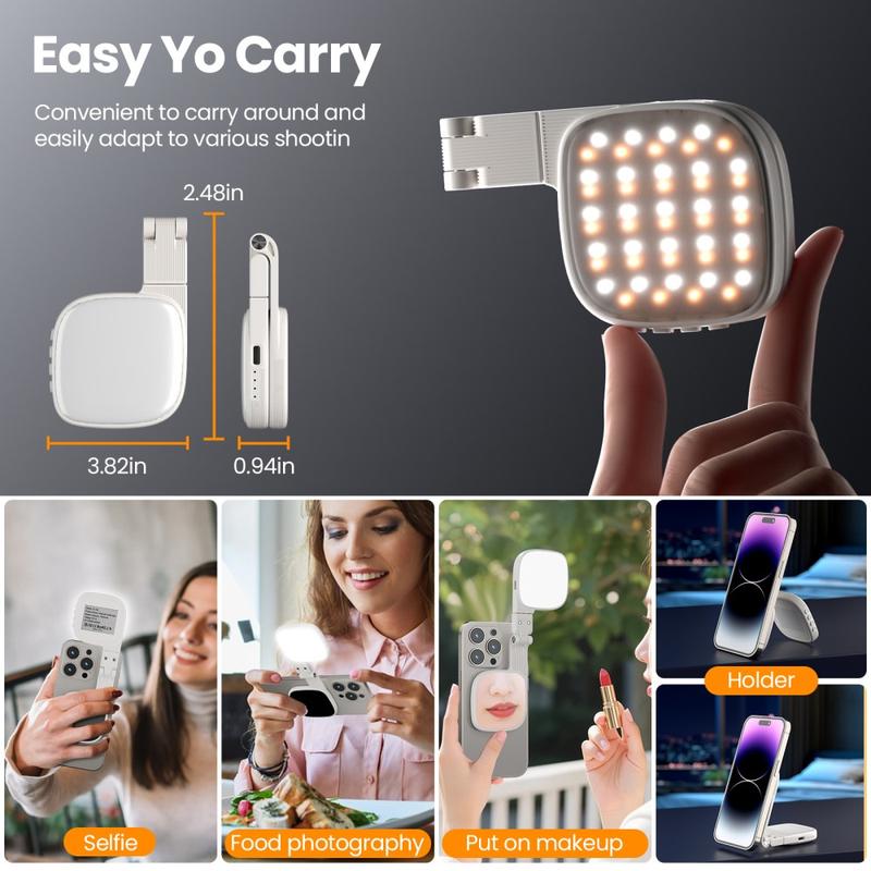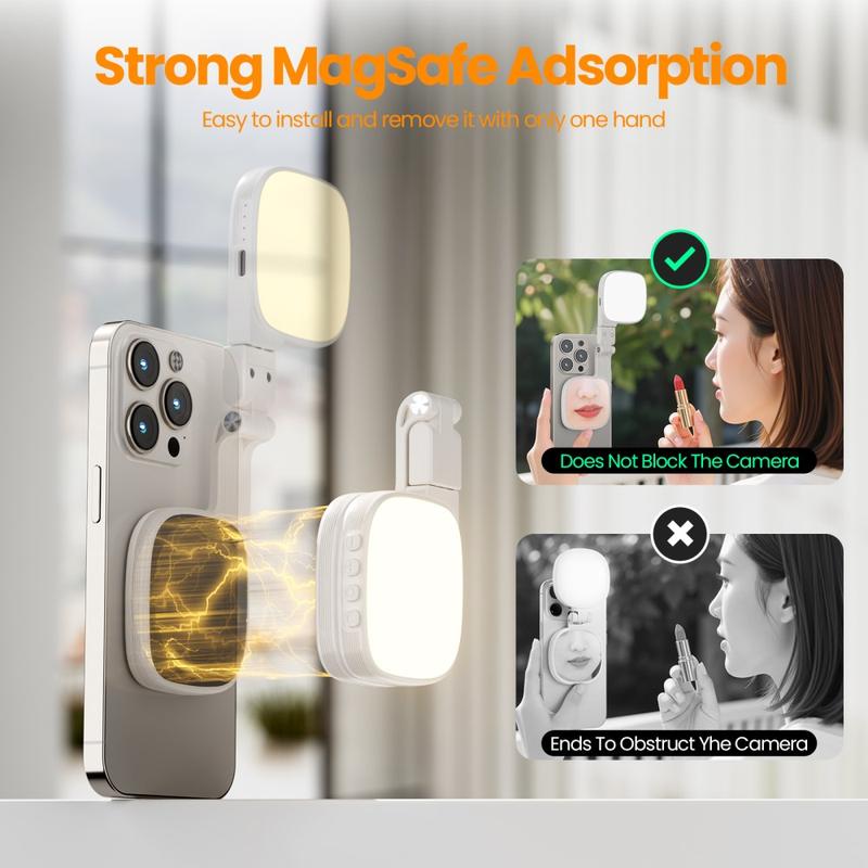Förbättra dina foton, videosamtal och livestreamar med det magnetiska LED-fyllnadsljuset XJ105 - ett ultraportabelt belysningsverktyg utformat för kreatörer, pendlare och alla som vill ha smickrande ljus när det behövs. Den starka magnetiska fästningen gör att du kan fästa den med en hand utan att blockera telefonens kameror, och om din telefon inte är magnetisk löser den medföljande magnetringen det på några sekunder. Med 48 LED-lampor (varma + kalla), 3 färgtemperaturlägen och 10 ljusstyrkenivåer kan du snabbt ställa in rätt utseende - mjukt och varmt för kvällsinnehåll, neutralt för möten eller kallt och skarpt för detaljerade bilder. Lägg till den vikbara designen och multi-vinkelrotationen, så blir XJ105 ditt kompakta studioljus som får plats i fickan.