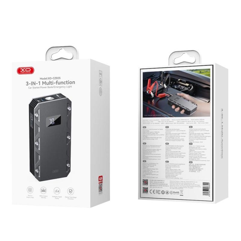 Var redo när batteriet är slut med XO CZ025: en kompakt 3-i-1-lösning som kombinerar en starthjälp för bilar, en bärbar powerbank och en ljusstark LED-ficklampa. Den är byggd för vardagliga förare och resenärer och ger tillförlitlig startkraft för 12V-fordon och håller din telefon och dina prylar laddade via dubbla USB-utgångar. Den digitala displayen gör det enkelt att snabbt kontrollera batteristatus, och ficklampan med flera lägen (inklusive SOS) är perfekt för situationer vid vägkanten.
