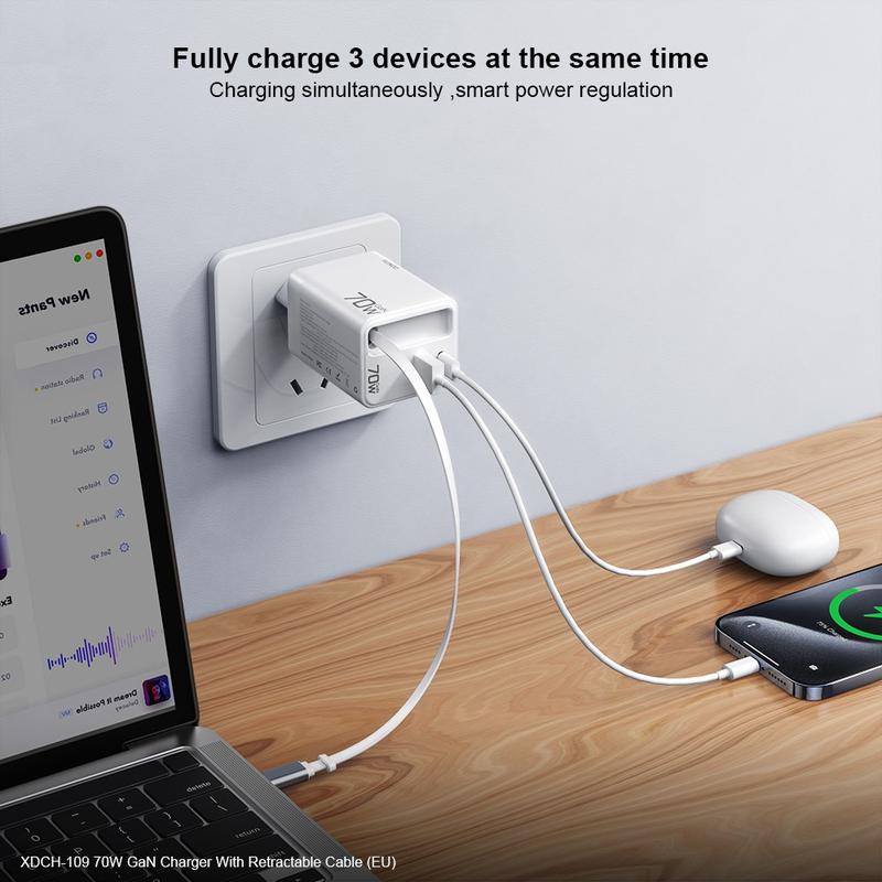 Xundd XDCH-109 70W GaN snabbladdare - EU-kontakt, utdragbar 60 cm USB-C-kabel och 3-portars strömadapter för bärbara datorer, surfplattor och smartphones