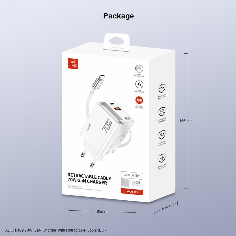 Ladda smartare, lättare och snabbare var du än befinner dig. XUNDD XDCH-109 innehåller banbrytande GaN-transistorer (galliumnitrid) i en 70W krafthubb i handflatformat som väger bara 0,141 kg. Den inbyggda 60 cm långa infällbara USB-C-kabeln eliminerar röriga sladdar, medan två extra utgångsportar delar ström på ett intelligent sätt för att fylla på upp till tre enheter samtidigt. Den här smidiga adaptern är certifierad för EU:s säkerhetsstandarder och anpassad för Samsung Super Fast Charging 2.0, USB-C Power Delivery 3.0 och PPS, och levererar wattstyrka på laptop-nivå i en fickvänlig ram - perfekt för arbete, resor och vardagsliv.