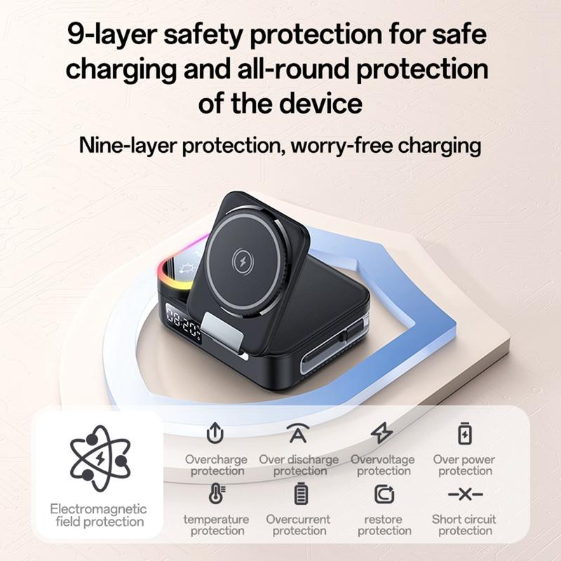 Yesido DS38 65W magnetisk trådlös laddningsstation - 8-i-1 snabbladdare med digital klocka, RGB-belysning och utdragbar USB-C-kabel
