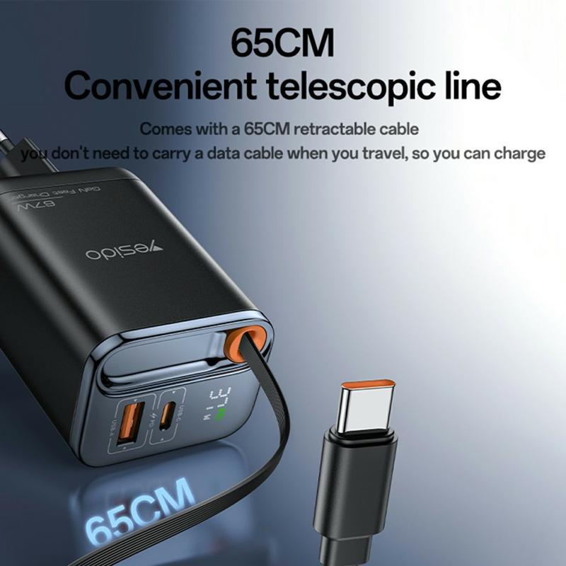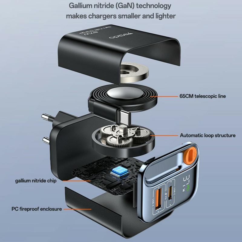 Yesido YC100 67W snabbladdare med utdragbar typ C-kabel - USB-A och USB-C GaN-laddningsadapter - EU-kontakt