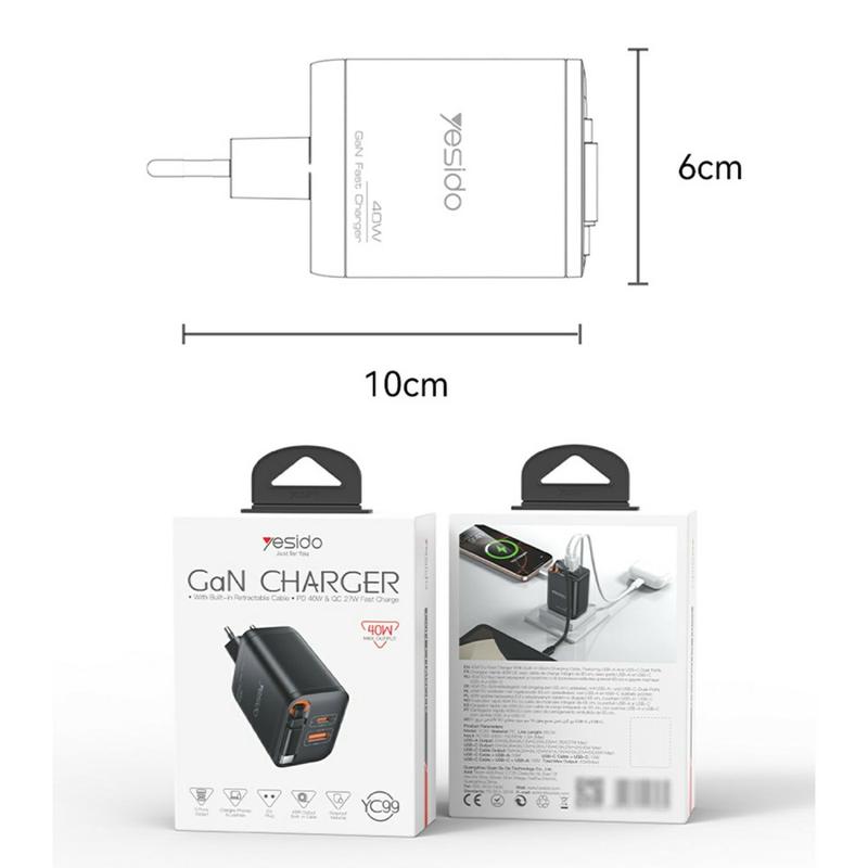 Yesido YC99 40W snabbladdare med utdragbar typ C-kabel - USB-A och USB-C GaN-laddningsadapter - EU-kontakt