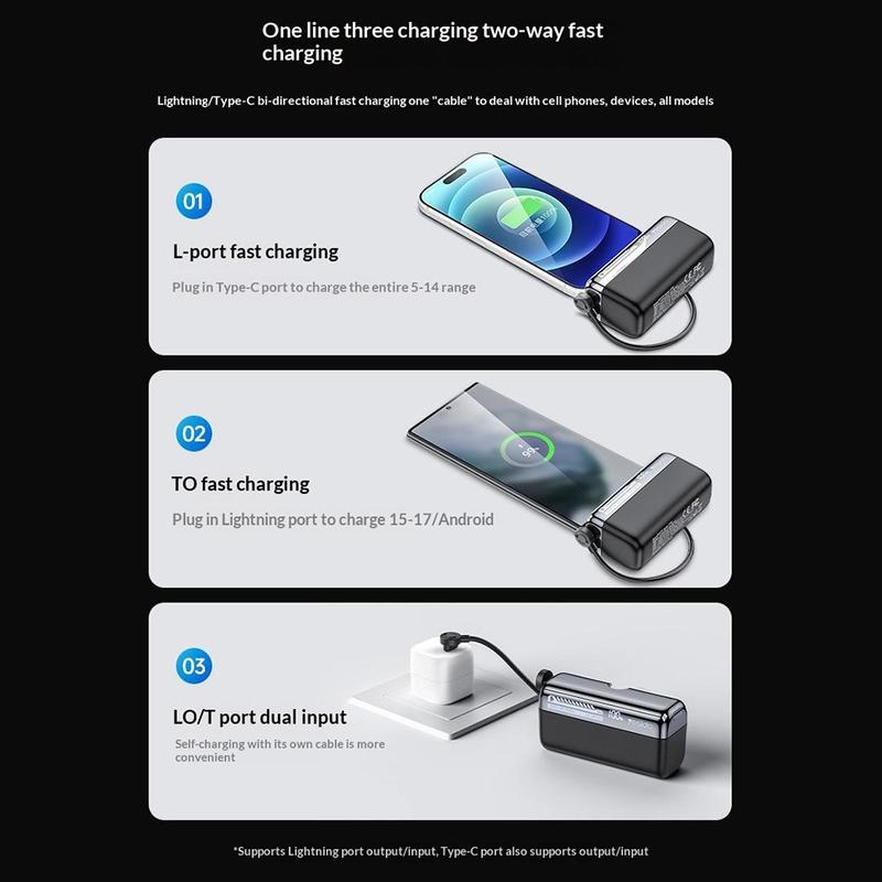 Både USB-C- och USB-L-portarna stöder dubbelriktad laddning, vilket gör att powerbanken själv kan laddas snabbt samtidigt som den erbjuder flexibla laddningsalternativ för enheter. Den kan stödja laddning av mer än en enhet beroende på dina användningsbehov, vilket gör den användbar för personer som bär med sig flera prylar under dagen. Denna extra flexibilitet bidrar till att göra den till ett mer mångsidigt bärbart laddningstillbehör.