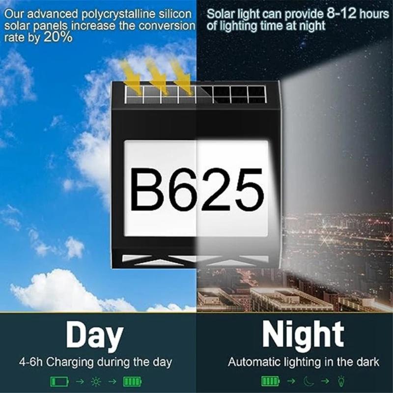 YH1101 suger upp dagsljuset genom en högeffektiv 4 V/0,6 W polysilikonpanel och lagrar det i ett 500 mAh-batteri. I skymningen tänds åtta SMD 2835 LED-lampor (≈ 40 lm) automatiskt och ger bakgrundsbelysning till de inkluderade siffrorna (0-9) och bokstäverna (A-E) i upp till 12 timmar. Borstat rostfritt stål motstår rost och saltstänk från kusten, medan IP54-tätningen skyddar mot damm och regn - perfekt för Europas varierande klimat.