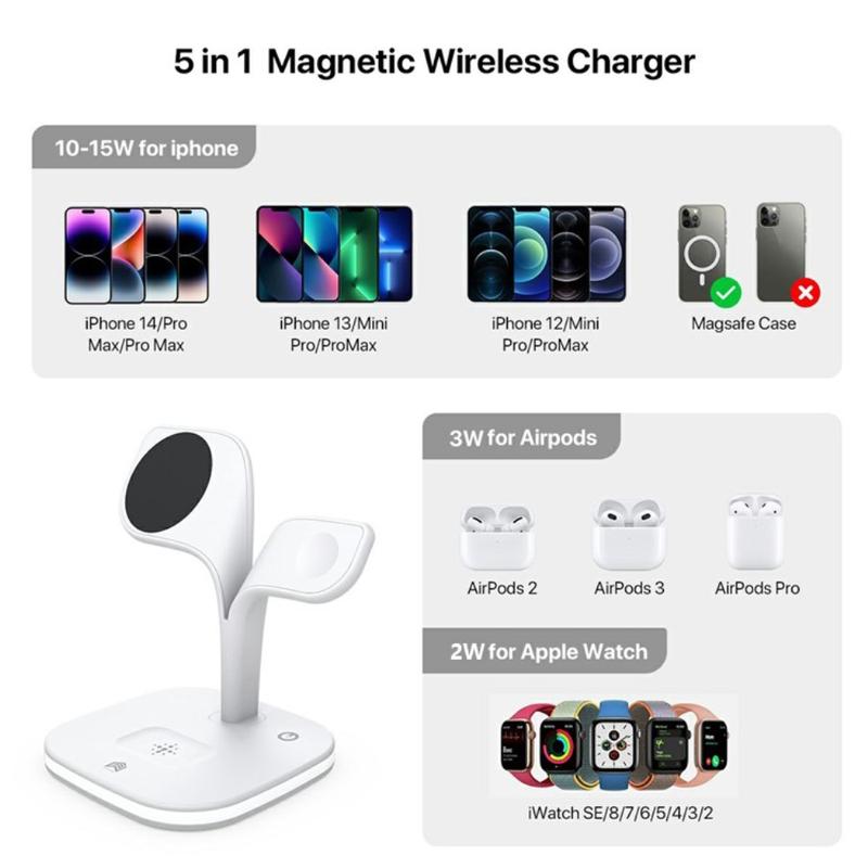 - 15W snabbladdning med MagSafe-kompatibilitet: Laddaren är inriktad på MagSafe-laddningsmagneter och ger snabbare och säkrare trådlös laddning. Den snabbladdar iPhone 17, 16, 15, 14, 13 och 12-serien (Pro/Pro Max/Mini/Plus) från 0 till 80 % på cirka 1,5 timme, samtidigt som den driver Apple Watch Series 1-10/Ultra/SE och AirPods 2/3 Pro/Pro 2.