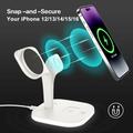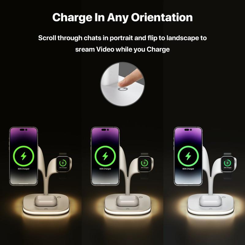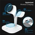 - 3-i-1 trådlös laddning: Utrustad med två inbyggda laddningsplattor som är kompatibla med MagSafe, möjliggör denna station samtidig laddning av din iPhone, Apple Watch och AirPods, vilket effektiviserar dina laddningsbehov.