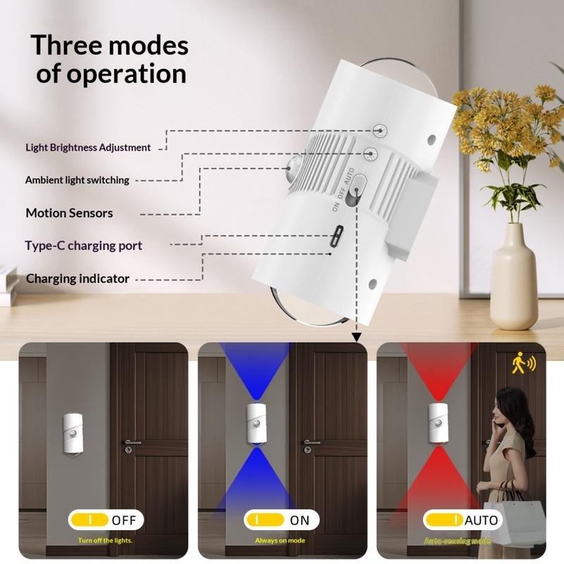 Dess smarta sensorsystem reagerar på rörelser i svagt ljus, tänds automatiskt och släcks efter en kort fördröjning för att spara energi. Med 4 ljusstyrkenivåer och flera belysningslägen kan den användas både som ett praktiskt nattljus och som ett mysigt stämningsljus. Den magnetiska installationsdesignen gör placeringen enkel, utan borrning eller komplicerad installation.